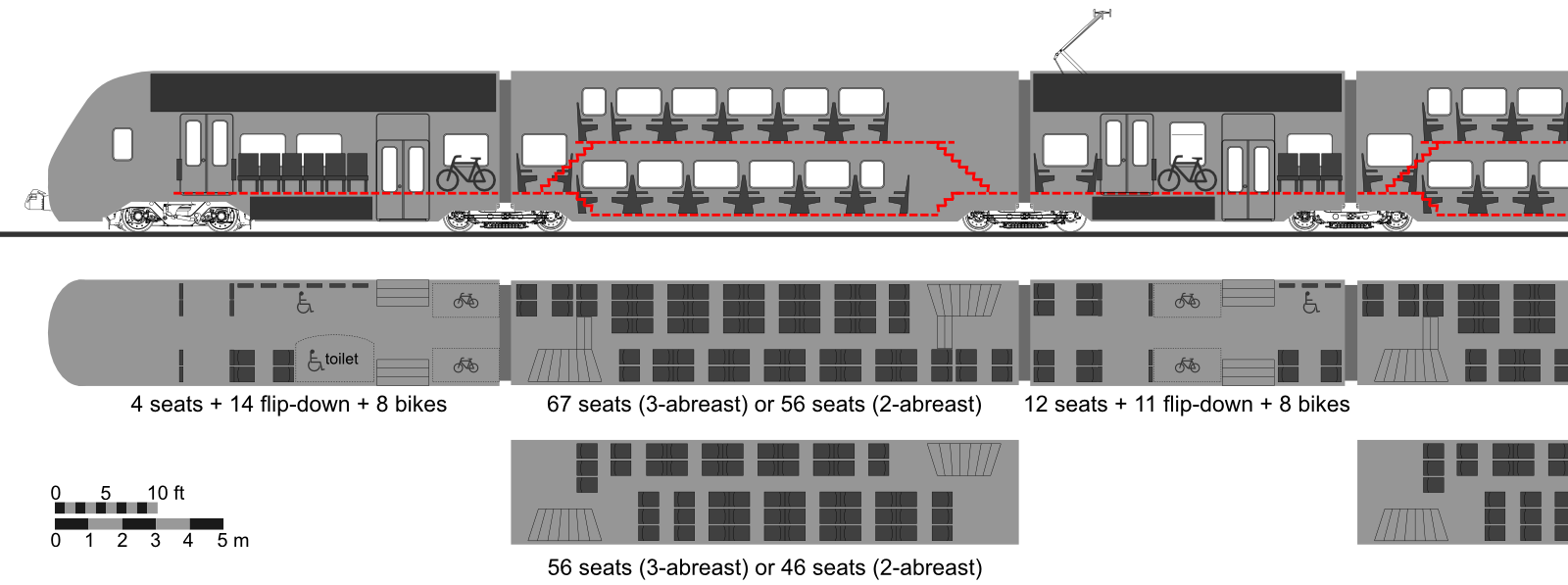Posted by WillD on Tue Sep 6 22:48:17 2011, in response to Readers' Choice Best Current EMU Design, posted by ChicagoPCCLCars on Tue Sep 6 10:47:38 2011. It's too bad the Talgo 22 wasn't selected by anyone, because the full-length bilevel articulated design was probably one of the most impressive designs to be created of late. It's too bad we couldn't get something like this for Metra's Rock Island or Milwaukee lines.![]() The Omneo is an equally interesting concept from Bombardier, and potentially illustrates a manner in which a bilevel EMU can operate with the sort of turnover seen in RER or S-bahn networks while not being devoid of seats for longer distance passengers. This illustration, from Mr. Tillier at the Caltrain-HSR compatibility blog, shows a door layout which includes multilevel doors to accommodate multiple platform heights. ![]() The Swedish push to improve their high speed rails has resulted in the Gröna Tåget, which includes a number of really cutting edge improvements on the Bombardier Regina. Like the Regina the Gröna Tåget will allow full accessibility at various platform heights. Except that the Gröna Tåget will replace the Regina's internal wheelchair lift at the low door with a full moving floor to adjust to various platform heights. The test train: But if I had to pick one EMU design I'd probably stick with the Neumeister designed counterpart to the Shinkansen Series 500 posted earlier. The Velaro E remains the fastest unmodified train, and it's by far and away one of the best trains I've had the pleasure of riding. IMHO RENFE's ads for their AVE Class 103 units are also some of the best for a rail system around. And besides, the Velaro looks *really* good in the proposed CHSRA Blue and Gold paint scheme: