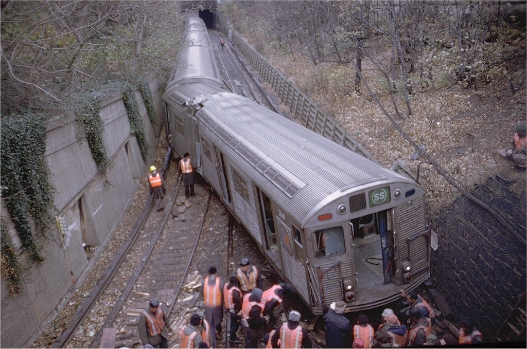Posted by gbs on Sun Dec 1 22:01:44 2019, in response to Tuscarora Almanac for December 1, posted by IRTRedbirdR33 on Sun Dec 1 12:45:41 2019. This is the same locations as the infamous Malbone Street Wreck which occurred on November 1, 1918 As this photo makes clear, this accident occurred near the site of the wreck of 1918, but not in the same location and not at all under the same circumstances. This train is switching from the south-bound track (the one in the 1918 wreck that takes sharp turns ahead) to the straighter north-bound track, and here the lead car collided with the embankment wall, not the tunnel wall as in 1918. This train was clearly not speeding out of control as in 1918, and this accident was not the operator's fault (though he might have still had to pee in a cup).