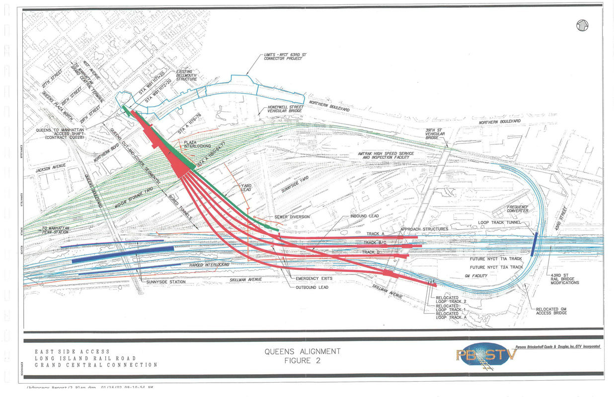 Posted by jamestrains1 on Wed Aug 12 00:38:53 2020, in response to Re: Queens Super Express Alignment, posted by jamestrains1 on Wed Aug 12 00:35:29 2020. *THIS IS A REPOST OF THIS POST WITH UPDATED URLS FOR THE IMAGES*An early plan for the East Side Access work included a Track/Tunnel for NYCT that would lead to a yard in the southeastern section of Sunnyside Yard. This image below shows the NYCT Yard Lead crossing above the LIRR tracks at the Norther Boulevard Crossing: ![]() NYCT T1A - Westbound Queens Super Express Track NYCT T2A - Eastbound Queens Super Express Track NYCT Yard Lead - track to proposed NYCT yard in unused southeastern section of Sunnyside Yard LIRR Track A - Westbound LIRR Track (there is a misprint in this image, as both LIRR Tracks are labled "LIRR Track A") A second image from a later plan of the bellmouth, (after the NYCT Yard and its Yard Lead were cancelled) can be seen below: ![]() NYCT T1A - Westbound Queens Super Express Track NYCT T2A - Eastbound Queens Super Express Track NYCT Yard Lead - track to proposed NYCT yard in unused southeastern section of Sunnyside Yard LIRR Track A - Westbound LIRR Track LIRR Track B/C - Peak Direction LIRR Track Below is an early (circa 2000-2001) very "Not-to-Scale" rendering of the East Side Access Sunnyside Tunnels that shows the NYCT Yard Lead: ![]() NYCT Yard Lead - track to proposed NYCT yard in unused southeastern section of Sunnyside Yard Inbound Lead Track - Westbound LIRR Yard Lead Track (towards Grand Central Terminal) Outbound Lead Track - Eastbound LIRR Yard Lead Track (towards the midday storage yard) Track A - Westbound LIRR Track Track B/C - Peak Direction LIRR Track Track D - Eastbound LIRR Track |